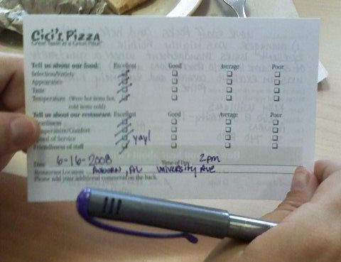 So we're all eating our pizza at our table- watching as the staff really pulled together to accommodate a large group (who by the way did NOT have reservations) and we're all impressed. Then I noticed the comment cards sitting near the exit. I got way excited, thought of my blog and the thank-you movement, and grabbed one up: